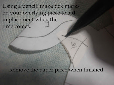 As you go, it is helpful to make these little tick marks so that you can line up your paper pattern with the finished edges of your applique.