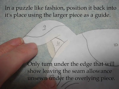 Next, cut out the whole image in one piece. This picture has an example of the cut out cow with all the pieces labeled and details drawn on. This piece will become a guide for placement, as well as the pattern pieces. Iron your piece onto the background fabric in the exact place you want the finished piece to be.
